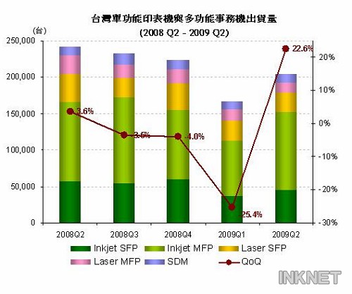 根據(jù)國(guó)際數(shù)據(jù)信息(IDC)最新發(fā)表的臺(tái)灣單功能打印機(jī)(SFP)與多功能事務(wù)機(jī)(MFP)產(chǎn)業(yè)調(diào)查季報(bào),2009年第二季臺(tái)灣單功能打印機(jī)市場(chǎng)整體出貨量達(dá)8萬(wàn)2,714臺(tái),雖然與去年同期相比仍衰退23.4%,但與上季相比已有11.4%的成長(zhǎng)。至于在噴墨多功能事務(wù)機(jī)(Inkjet MFP)方面,出貨量為10萬(wàn)6,914臺(tái),較上一季出貨成長(zhǎng)超過(guò)四成,與去年同期相比,也僅有1.7%的衰退幅度,在第二季臺(tái)灣打印機(jī)市場(chǎng)中表現(xiàn)最為亮眼。