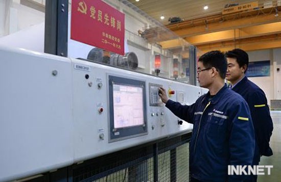 工人在數(shù)十噸重的銅版紙紙卷前操作設(shè)備
