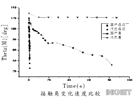 在研究噴墨印花油墨的動態(tài)表面張力及接觸角時,我們對國產(chǎn)油墨DST曲線及其接觸角變化速度,進口油墨DST曲線及其油墨接觸角變化速度分別進行了實驗。對接觸角變化速度進行了比較。(詳見圖表)