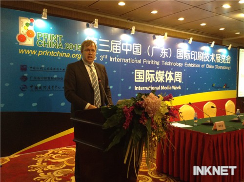 由中國印刷及設(shè)備器材工業(yè)協(xié)會主辦的PRINT CHINA 2015國際媒體周活動2014年12月9日-11日在東莞會展國際大酒店如意廳舉辦,其中,12月10日,舉行了“印刷行業(yè)形勢及展商參展方案介紹會”,佳能中國有限公司專業(yè)產(chǎn)品打印本部市場部高級經(jīng)理康品德發(fā)表了《數(shù)碼印刷 全在佳能》的演講。