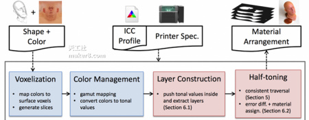 “更不透明彩色材料的引入將讓我們的算法使用較少的層即可打印出較大的色域,從而提高性能。更好地利用并行計(jì)算技術(shù)是我們?cè)谔嵘?D打印機(jī)分辨率、和打印體積的關(guān)鍵研究方向。隨著3D打印使用材料數(shù)量的增加,根據(jù)3D打印機(jī)的特性以及計(jì)算能力考慮打印模型變得更加重要。”