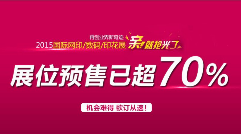 轟動(dòng)業(yè)界的年度盛事——“2015國(guó)際網(wǎng)印及工業(yè)數(shù)碼噴印/紡織品印花技術(shù)設(shè)備/數(shù)碼印花工業(yè)技術(shù)設(shè)備展”將于2015年11月17-19日在廣州琶洲保利世貿(mào)博覽館隆重揭曉。自展位預(yù)售工作啟動(dòng)以來(lái),老展商們反饋積極,均表示會(huì)繼續(xù)參展,而新展商的報(bào)名也十分踴躍。截止至目前,已定出70%的展廳面積,共計(jì)已有近300家國(guó)內(nèi)外參展商確定參展,其中特裝展位超過(guò)70%。好展位先到先得!請(qǐng)未確定展位的參展商抓緊最后機(jī)會(huì),從速計(jì)劃!