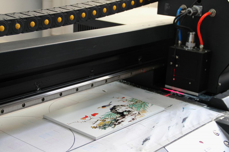 傳統(tǒng)漆畫的裝飾方法是用天然大漆或油性涂料直接“徒手”繪制,對操作者的操作技法和美術(shù)功底有極高的要求,且生產(chǎn)周期長,產(chǎn)量低,不能適應(yīng)現(xiàn)代工業(yè)化大規(guī)模生產(chǎn)要求。UV數(shù)碼噴印技術(shù)通過拍攝、掃描珍貴美術(shù)、書法作品,使之變成數(shù)碼圖的形式直接參與生產(chǎn),根據(jù)客戶需要,可以隨時通過電腦軟件對畫的尺寸大小、色彩等進(jìn)行個性化制作、編輯,達(dá)到“手到擒來”的效果,擺脫了曬圖、針刻等繁復(fù)的工藝,且打印色彩更鮮艷、色域更寬廣,還可以模擬“立體”效果。 “傳統(tǒng)的漆畫工藝生產(chǎn)一副1平米的漆畫,一般技師級別的需要10天半個月,大師級別也要一周!而通過UV數(shù)碼噴繪技術(shù)只需要幾分鐘時間就能完成,而且還能批量生產(chǎn)。”吳智慧堅(jiān)定地說,“我們還改進(jìn)了噴印設(shè)備核心部件“噴頭”的設(shè)計(jì),采用與畫面材質(zhì)“零接觸”高平整度、精度的‘隔離式’噴頭,使得油墨能平整、均勻地被噴射到材質(zhì)表面,同時我們通過控制噴頭的打印時間、速度和噴量來控制畫面的立體感。”采訪現(xiàn)場,記者看到,UV數(shù)碼打印機(jī)把拍攝或掃描的素材(圖形語言)變成程序語言后,幾分鐘就能完成一副漆畫,且立體、形象、美觀。
