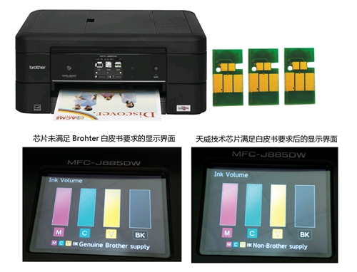 天威技術(shù)開發(fā)有限公司(天威技術(shù))于2015年8月21日全球首家推出適用于兄弟二代升級(jí)版打印機(jī),同時(shí)滿足兄弟于今年8月發(fā)布的通用芯片技術(shù)白皮書要求。天威稱,配有其下芯片產(chǎn)品的噴墨打印機(jī)墨盒在安裝完成后可顯示“Non-Brother supply”(非兄弟耗材)信息。