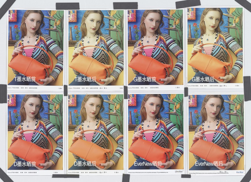 如上圖所示,EverNew同市場上其他普通染料墨水在同等條件下耐光測試對(duì)比