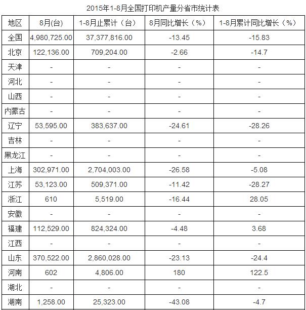 2015年8月中國打印機產(chǎn)量為4,980,725.00臺,同比下降13.45%。2015年1-8月止累計中國打印機產(chǎn)量37,377,816.00臺,同比下降15.83%。2015年8月全國打印機數(shù)據(jù)表如下表所示: