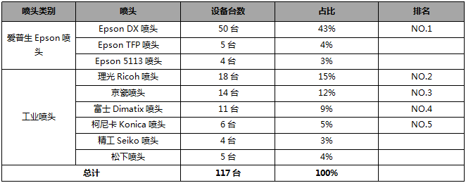 設(shè)備增長(zhǎng)臺(tái)數(shù)TOP3噴頭依次:Epson DX(增長(zhǎng)30臺(tái))、理光Ricoh(增長(zhǎng)9臺(tái))、富士Dimatix(增長(zhǎng)6臺(tái))。