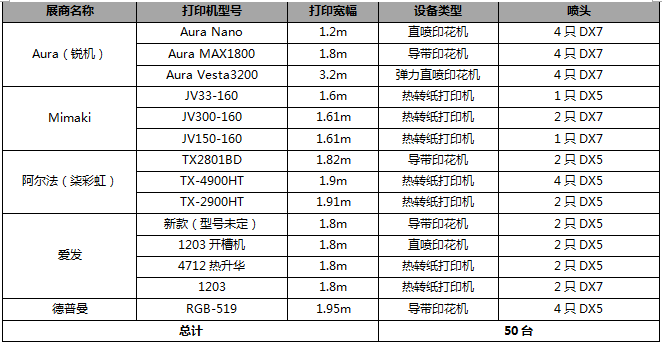 共統(tǒng)計(jì)Epson DX噴頭設(shè)備50臺(tái),以使用DX5、DX6、DX7為主。
