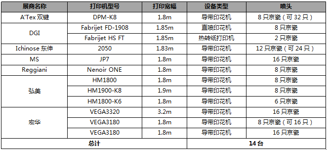 展會(huì)共統(tǒng)計(jì)京瓷噴頭印花機(jī)14臺(tái),使用京瓷KJ4B噴頭(2656只噴嘴)。