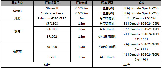 共統(tǒng)計(jì)11臺(tái)Dimatix噴頭數(shù)碼印花機(jī)。具體型號(hào)包括:Spectra256(Kornit)、星光噴頭SG1024(大部分展商)