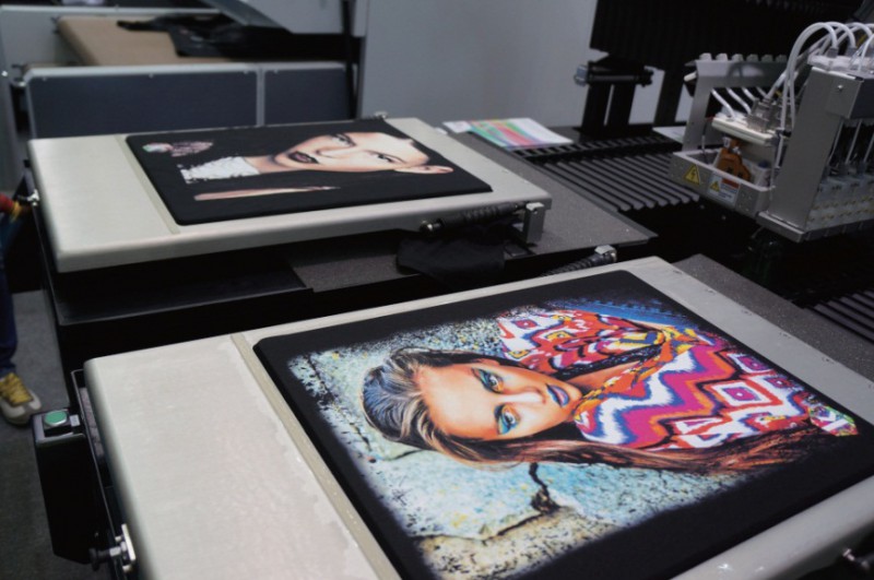 現(xiàn)場(chǎng)展示導(dǎo)帶印花和T恤涂料印花兩種方案。