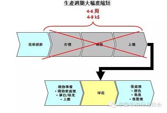 2. 20世紀80年代以來,紡織品印花的市場發(fā)生了很大的變化。市場希望印花企業(yè)能夠滿足“快速反應(yīng),周期短;彈性生產(chǎn),靈活多變;高品質(zhì),色彩豐富;低成本;生態(tài)環(huán)保”等要求。傳統(tǒng)印花因制版,對小樣等原因,制作小樣時間通常需要2周左右時間。在生產(chǎn)繁忙季節(jié),企業(yè)根本無法滿足客戶快速試樣的要求??紤]到成本因素,對于小批量,多花色的時裝訂單,很多工廠更是有心無力。而數(shù)碼印花工藝恰恰契合了當今市場快速變化的要求。無需制版,按照客戶的要求,可實現(xiàn)1米起印。正常情況下,采用數(shù)碼印花工藝,企業(yè)1~2天內(nèi)就可交單。大大縮短了生產(chǎn)周期。參看圖4.