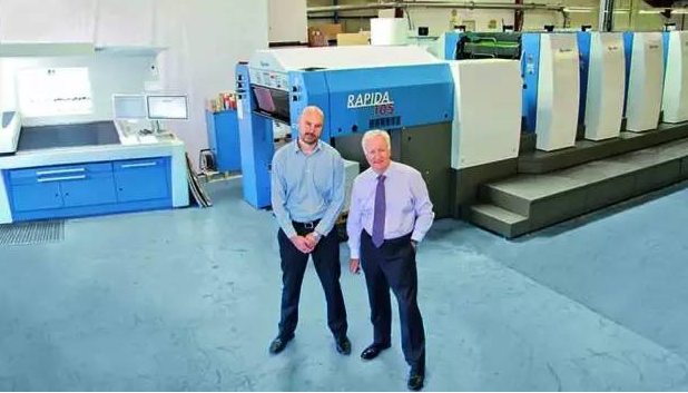 圖2:英國(guó)印刷:公司Blackmore銷售和營(yíng)銷總監(jiān)David Bland和生產(chǎn)總監(jiān)Nigel Hunt站在新近購(gòu)買(mǎi)的帶LED-UV固化功能的利必達(dá)106前合影留念