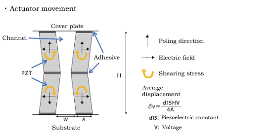 由壓電材料構(gòu)成的微型通道在電荷的作用下收縮。通道收縮時(shí),通道所含油墨從噴嘴擠出,形成墨滴。通道恢復(fù)到原始狀態(tài)時(shí),毛細(xì)作用導(dǎo)致油墨流回通道,以準(zhǔn)備產(chǎn)生下一個(gè)墨滴。