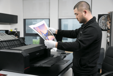 對(duì)于劉軼恒團(tuán)隊(duì)來(lái)說(shuō),日常工作中經(jīng)常遇到的一個(gè)棘手的問(wèn)題就是,A2及A2以下幅面,并且輸出量不大的訂單。用大幅面打印機(jī)輸出的時(shí)候需要人工盯守,確保紙張平整,還需要裁切、壓平等工序,這些都消耗許多額外的成本。“那么對(duì)于這一類(lèi)訂單,像佳能PRO-500這樣的桌面型打印機(jī)就非常好的解決了我們的‘痛點(diǎn)’,制作的時(shí)候只需要用Print Studio Pro軟件將參數(shù)設(shè)置好,將紙張放在托盤(pán)中,他就可以自動(dòng)打印了。”