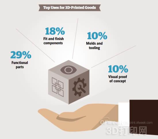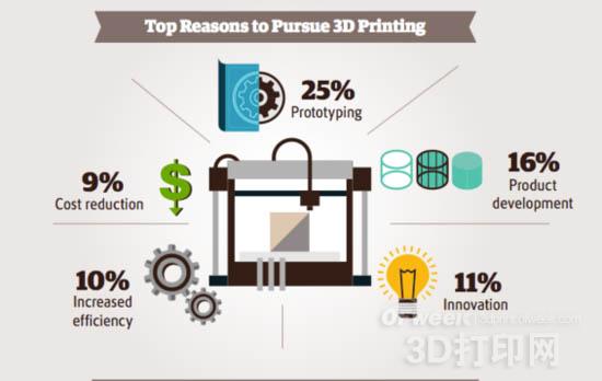 報告中稱,目前2/3的制造商已經(jīng)在某種程度上使用3D打印技術(shù),25%的制造商計劃將來采用這種技術(shù)。企業(yè)采用3D打印技術(shù)的最大原因包括:制作原型(占比25%)、產(chǎn)品開發(fā)(占比16%)以及創(chuàng)新(占比11%)。