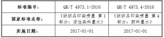 據(jù)悉,2016年7月28日,國家工信部發(fā)布了中華人民共和國工業(yè)和信息化部公告(2016年第37號),批準了一批行業(yè)標準,其中包括 5項全國紡織品印染噴墨行業(yè)標準,將于2017年1月1日起開始正式實施。