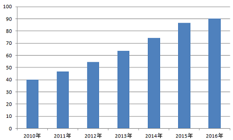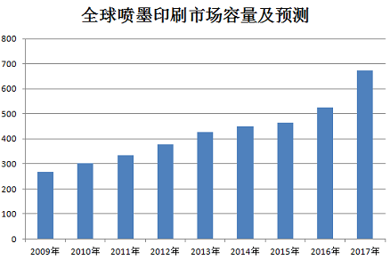 噴墨印刷是全球印刷業(yè)發(fā)展的焦點(diǎn),在占全球總規(guī)模一半的北美印刷市場(chǎng),年收入增長(zhǎng)的70%來自噴墨印刷。根據(jù)皮拉國(guó)際(Pira International)的統(tǒng)計(jì),2009年噴墨印刷的市場(chǎng)總量是268億美元,較2005年增長(zhǎng)了58.2%。在2011年,市場(chǎng)規(guī)模達(dá)到了334億美元,預(yù)計(jì)到2015年市場(chǎng)總量將達(dá)到465億美元,2017年市場(chǎng)總量將達(dá)到673億美元,平均復(fù)合增長(zhǎng)將保持在10.3%左右。全球噴墨印刷設(shè)備行業(yè)市場(chǎng)規(guī)模如下圖所示: