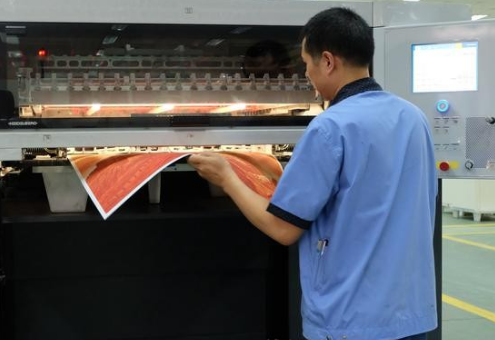 印刷技師將《許仁龍萬里長城銅版畫》畫框產(chǎn)品從印刷設備中取出
