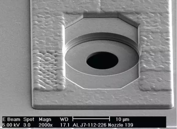 硅噴嘴板安裝在印刷頭的增壓歧管上,該歧管將產(chǎn)生恒定的壓力和流量,從而生成穩(wěn)定的墨流。運用物理原理,在啟動噴嘴的加熱器后,該穩(wěn)定的墨流將被分解為均勻的墨滴。加熱器的激活頻率大于400千赫,有足夠的能量從局部上降低孔中墨滴的粘度和表面張力,最終以每秒20米的速度生成單個的墨滴。要在噴嘴表面生成墨滴,所需的能量極低,噴嘴溫度上升幅度不超過室溫5ºC,低于熱敏按需噴墨(DoD)所需能量的五十分之一。熱敏按需噴墨要讓流體形成墨滴,溫度需要達到100ºC。