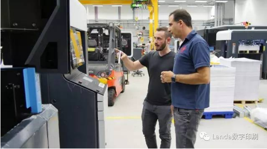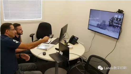 圖2-3:Graphica Bezalel的二代繼承人Itai Harpak先生(穿黑色T恤者)正在接受操作首臺商用LandaS10納米圖像數(shù)字印刷機(jī)的培訓(xùn)