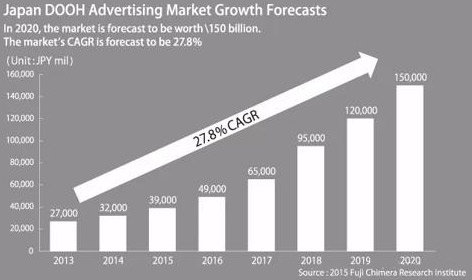 根據(jù)上圖預(yù)測,今年日本整體戶外廣告市場收入將達(dá)46.6億美金,其中傳統(tǒng)廣告收入41.1億美金,數(shù)字戶外收入5.5億美金。 根據(jù)PeterJ.Solomon公司2016年的調(diào)查,2013–20年,全球數(shù)字戶外廣告市場預(yù)計(jì)將實(shí)現(xiàn)13.2%的年度復(fù)合增長率,而根據(jù)富士總研社2015年的數(shù)字標(biāo)牌研究報(bào)告,在日本,這一數(shù)字將為27.8%,展示出強(qiáng)大的增長能力。此外,海洋戶外2016年的研究報(bào)告將日本數(shù)字戶外從現(xiàn)在到2021年的增長率預(yù)估為86%,超過了移動(dòng)(67%)和在線廣告(49%)的增幅。 根據(jù)富士總研社的研究報(bào)告,如下圖,2020年,數(shù)字戶外廣告市場價(jià)值預(yù)計(jì)將達(dá)1500億日元,復(fù)合年度增長率為27.8%。