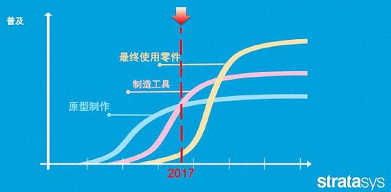 3D打印應用的發(fā)展路徑可分為三個階段,原型制作-工裝夾具的制造-打印最終零部件,層層推進。目前,最大的應用領域仍然是原型制作,也就是借助3D打印縮短產(chǎn)品設計循環(huán),加速推向市場。Stratasys認為,目前市場正處于第一階段向第二階段過渡的拐點,最終零件生產(chǎn)開始起步。到2019年前后,3D打印在最終零件生產(chǎn)的應用將超過工具制作的應用。