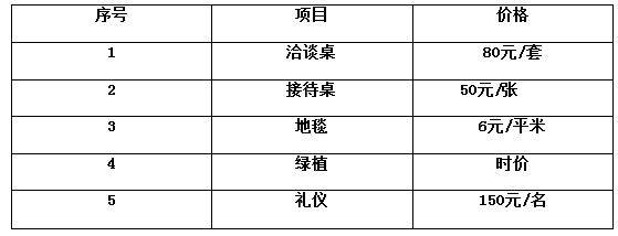 為了滿足展商的參展需求,組委會提供現(xiàn)場有償租賃服務(wù),項目包括洽談桌椅、接待桌、地毯、綠植、禮儀等。具體費用見租賃明細表。
