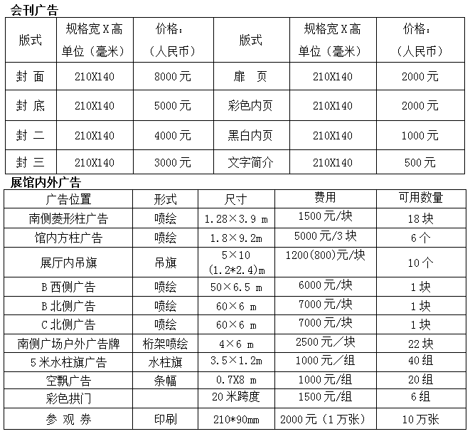 1.國(guó)際標(biāo)準(zhǔn)展臺(tái)(9 M²):國(guó)內(nèi)企業(yè)4000元/個(gè),國(guó)外企業(yè) $800/個(gè)(角位展臺(tái)加收10%);(含中英文楣板、三面圍板、一張洽談桌、兩把椅子、兩盞射燈、一個(gè)220V/2A電源插座、客戶登記本、簽字筆等);
