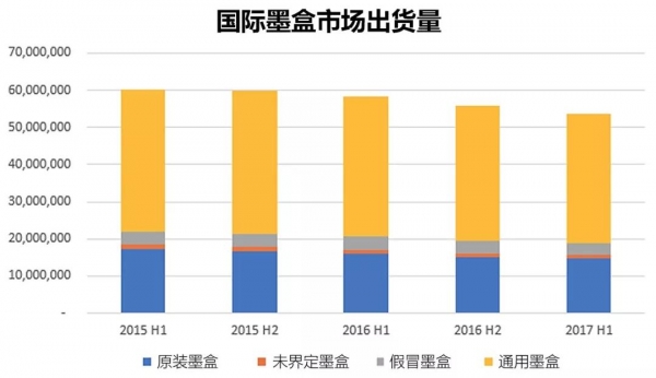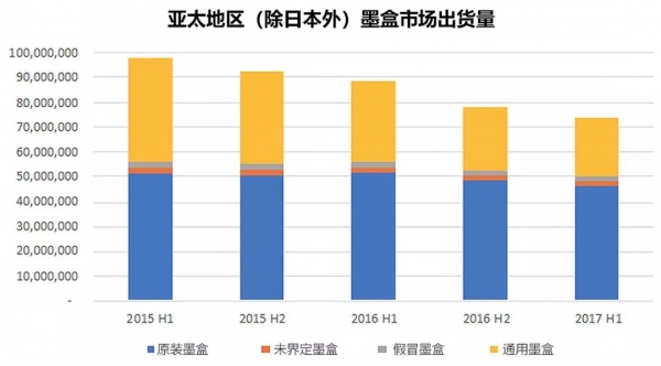 過去三年,亞太地區(qū)(除日本外)的墨盒和激光打印機硒鼓出貨量一直呈下降趨勢。單看該地區(qū)墨盒市場的出貨量會發(fā)現(xiàn),從2015年上半年到2017年上半年,亞太地區(qū)(除日本外)墨盒的出貨量從9,800萬個下降到了7,360萬個。與此類似的是,激光打印機硒鼓的出貨量從2015年上半年的6,020萬支下降到了2017年上半年的5,370萬支。上述出貨量下降的原因如下: