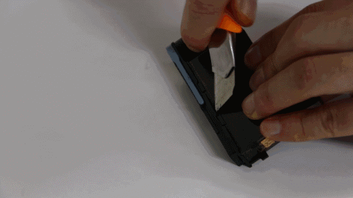 使用工具輔助打開護蓋——惠普大幅面打印機有一體式打印頭,也就是不同的顏色墨水都可以通過一體式打印頭去打印,是有螺絲固定;不過今天,我們給大家演示的打印頭是獨立式打印頭,這種打印頭是沒有螺絲固定,它只是通過塑料卡位密封住的,所以拆解時需要使用壁紙刀或一字螺絲刀去撬開打印頭護蓋周邊的卡位。