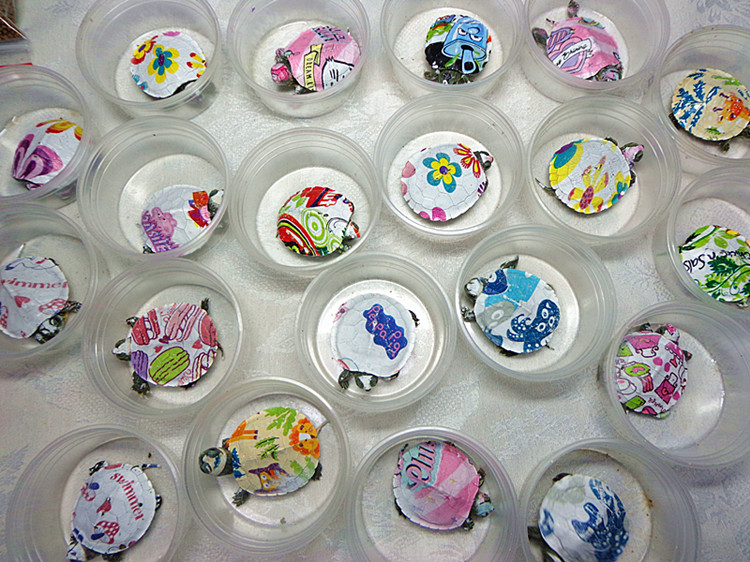 這款網(wǎng)紅爆款產(chǎn)品叫七彩小烏龜, 最早是義烏人搗鼓出來的,加工過程就是用含樹脂的UV墨水在烏龜殼上打印圖案, 然后用紫外線燈把墨水干燥, 這個過程跟刷漆沒有什么兩樣, 完全是傷害小烏龜。