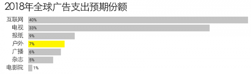 這是除了電影之外發(fā)展最快的非互聯(lián)網(wǎng)廣告媒體,它的規(guī)模更小,這使百分比增長(zhǎng)更明顯,并且這種增長(zhǎng)主要集中在中國。在過去六年中,戶外廣告占總廣告支出的7%,其表現(xiàn)優(yōu)于包括電視在內(nèi)的其他非互聯(lián)網(wǎng)媒體,