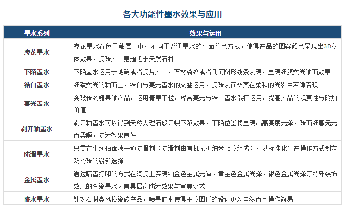 功能性墨水在使用上主要定義為,將特殊效果釉料以墨水的形態(tài)通過噴墨機(jī)操作施釉,借以滿足瓷磚產(chǎn)品標(biāo)準(zhǔn)化生產(chǎn)需求。因此,功能性墨水的問世,是釉用材料的一場革命。