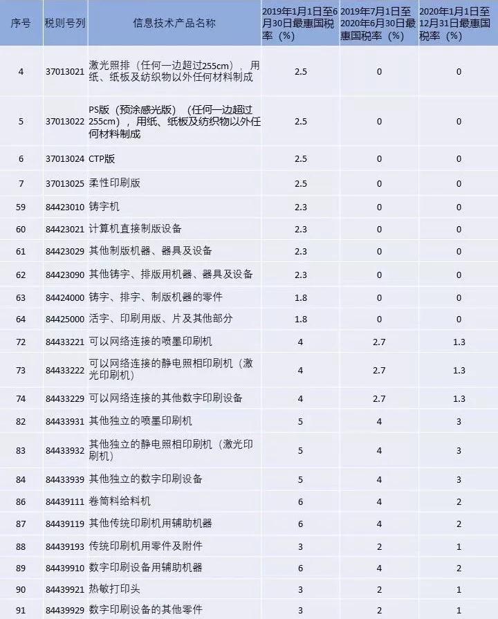 在2019年7月1日之后,“激光照排片(任何一邊超過(guò)255mm),用紙、紙板及紡織物以外任何材料制成” “PS版(預(yù)涂感光版) (任何一邊超過(guò)255mm),用紙、紙板及紡織物以外任何材料制成” “CTP版” “柔性印刷版”等印刷版材類(lèi)產(chǎn)品實(shí)施的最惠國(guó)稅率已經(jīng)為零;“鑄字機(jī)” “計(jì)算機(jī)直接制版設(shè)備” “其他制版機(jī)器、器具及設(shè)備” “其他鑄字、制版用機(jī)器、器具及設(shè)備”等印前設(shè)備類(lèi)產(chǎn)品實(shí)施的最惠國(guó)稅率也已經(jīng)為零。2020年全年,以上產(chǎn)品實(shí)施的最惠國(guó)稅率依然為零。