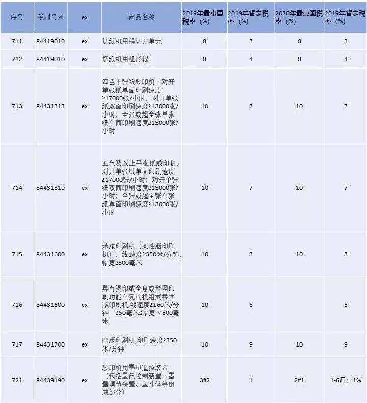 在2020年6月30日之前,“傳統(tǒng)印刷機(jī)用零件及附件” “熱敏打印頭” “數(shù)字印刷設(shè)備的其他零件” 等產(chǎn)品實(shí)施的最惠國(guó)稅率均為2.0%(2019年7月1日從3.0%下降到2.0%),但在2020年7月1日以后,這些產(chǎn)品的關(guān)稅將再下降1個(gè)百分點(diǎn),到1.0%。