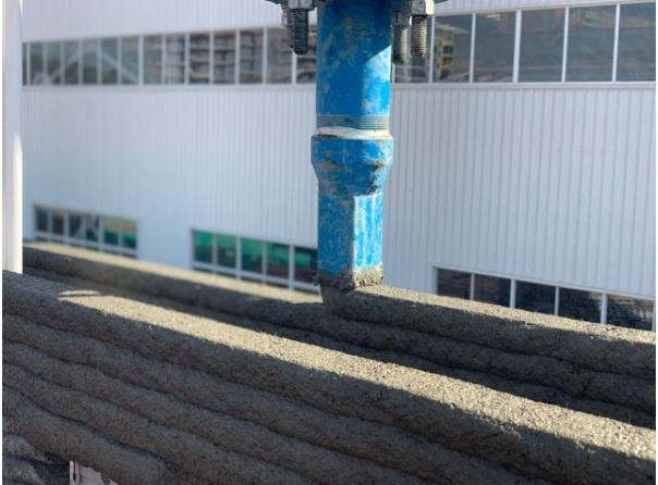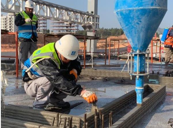 傳統(tǒng)工藝在主體施工中涉及到模板、鋼筋和混凝土三個(gè)方面,3D打印技術(shù)的所有工藝也是圍繞著這三個(gè)內(nèi)容進(jìn)行的。目前3D打印還無(wú)法打印鋼筋,鋼筋布置還需要依靠人工。但混凝土澆筑所需要的模板,在3D打印建筑的施工現(xiàn)場(chǎng)卻沒(méi)有,因?yàn)?D打印頭里噴出的混凝土可不一般。因此,在打印過(guò)程中,隨著墻體的不斷長(zhǎng)高,需要按照?qǐng)D紙去加裝鋼筋。