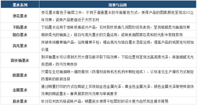 功能性墨水在使用上主要定義為,將特殊效果釉料以墨水的形態(tài)通過噴墨機操作施釉,借以滿足瓷磚產(chǎn)品標準化生產(chǎn)需求。因此,功能性墨水的問世,是釉用材料的一場革命。