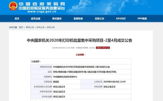 中央國家機關(guān)打印機集采 2-4月合并 截圖自ccgp.gov.cn