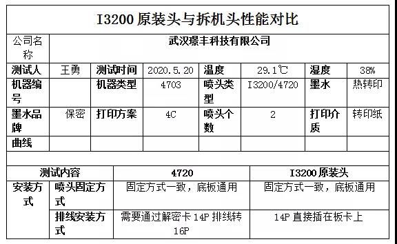 從基本環(huán)境來看,溫度是理想的,但是濕度顯然就低了點,良好的濕度應該在60%左右。靜電產(chǎn)生的概率會高一些。由此產(chǎn)生飛墨的可能性增大。由于主要是測試噴頭的性能所以采用的是打點、色塊、速度等著眼點,并且是打印轉印紙,故此沒有考慮色彩管理部分。從連接安裝噴頭來看,由于4720需要解密卡所以多了一個轉接解密卡的排線。I3200的則不需要了。