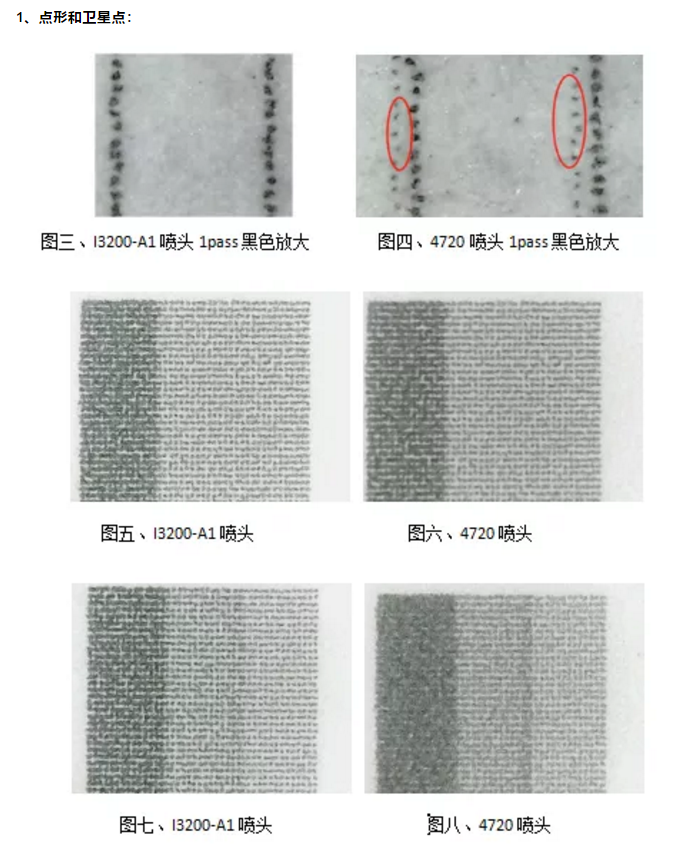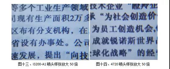 由圖三、四中我們很明顯的看到4720噴頭出來的每個點都有規(guī)律的衛(wèi)星點或者也可以說是飛墨。并且主墨點和衛(wèi)星點或者說飛墨位置相對固定,并伴有抖動。而I3200-A1明顯沒有類似飛墨和衛(wèi)星點。是否有衛(wèi)星點和飛墨對于小字和精度畫面的質(zhì)感非常重要。我們在圖五~圖八中就可以明顯看出來畫面品質(zhì)的差距。