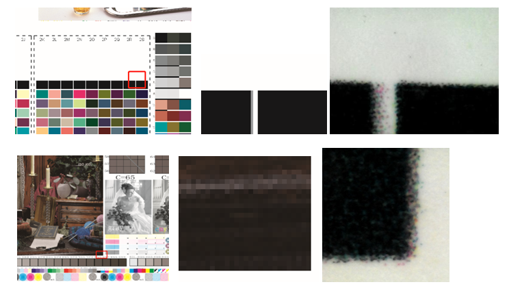 以上圖示放大50倍的情況下,觀察很明顯表現(xiàn)為深色色塊橫向縱向邊緣均疊印較好,顏色稍淺則橫向疊印優(yōu)過(guò)縱向疊印。