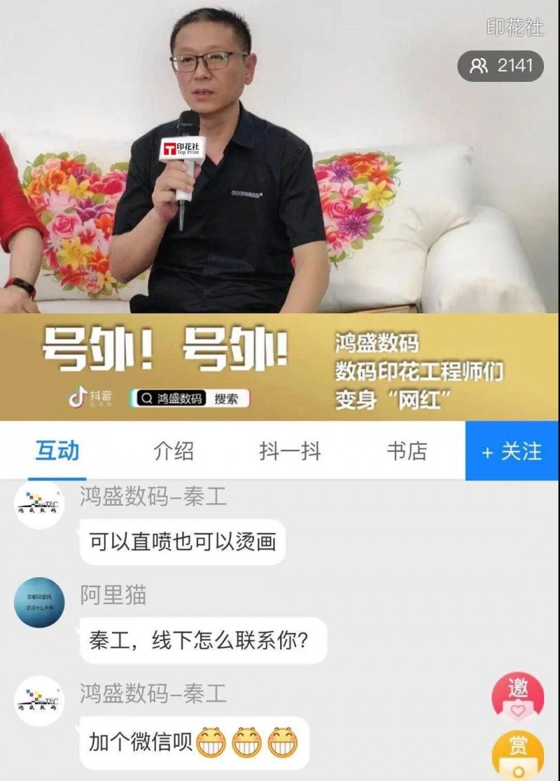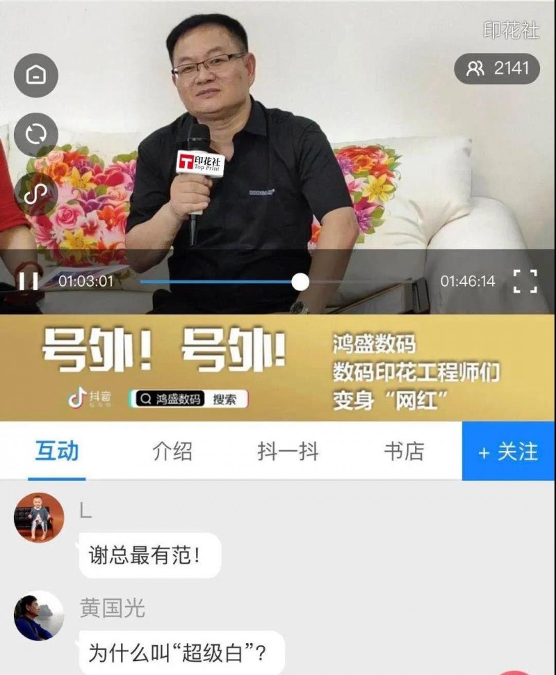 直播過程中,鴻盛數(shù)碼董事長秦國勝先生和總經理助理兼數(shù)碼印花事業(yè)部高級產品經理謝竟先生,先后向鏡頭前的行業(yè)朋友們問好,簡述了當前白墨數(shù)碼印花市場的痛點:進口白墨成本高、抗拉伸性差、牢度差、易產生皸裂、白度不夠制約因素,同時也對直播間觀眾的提問進行實時互動解答,一番熱鬧景象!