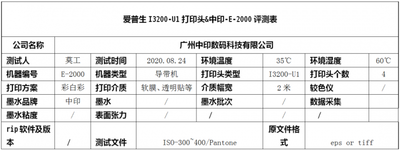 測(cè)評(píng)主要分為兩部分,采用1個(gè)打印頭做車(chē)貼打印樣品測(cè)試,通過(guò)1pass和4pass打印出來(lái)的測(cè)試報(bào)告,顯示機(jī)器適配程度,打印頭采用錯(cuò)位安裝,板卡選取北京博源恒芯,波形狀塊在打印過(guò)程中只有1種。根據(jù)墨水的適配性,溫度控制在36-40度,打印頭基準(zhǔn)電壓隨打印頭、板卡及墨水走,配置5um的柱形過(guò)濾,整體采用負(fù)壓的供墨方式。