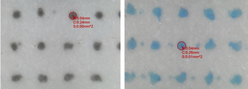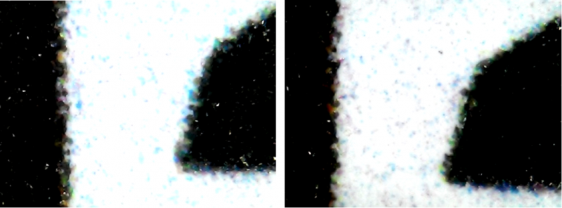 四色疊印,邊緣較銳利。但是有不同程度的飛墨點(diǎn)。這點(diǎn)要引起重視。