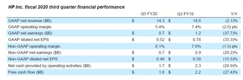 惠普發(fā)布了2020財年第三財季財報。報告顯示,惠普第三財季凈營收為143億美元,同比下降2.1%;凈利潤為7億美元,同比下降37.7%;不按照美國通用會計準(zhǔn)則的凈利潤為7億美元,同比下降20.2%。