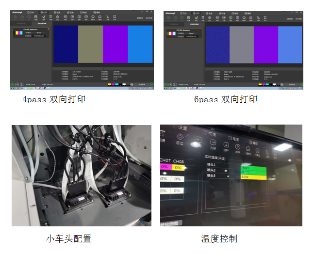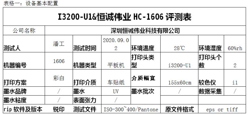HC-1606小型平板機(jī)選用漢森板卡,墨水沒有作特殊選配,溫度適配度控制在28℃左右,相對濕度60%rh,測試分別采用了單頭、雙向4pass和6pass在車貼上不間斷打印超過10米。整個打印過程中,并沒有選擇羽化效果,單點(diǎn)點(diǎn)火頻率控制為43.2HZ,精度達(dá)到3.8PL,精度高速度快。多點(diǎn)點(diǎn)火頻率21.6ZH,漸變模式下,墨滴精度可達(dá)3.8-12PL,顏色飽滿。
