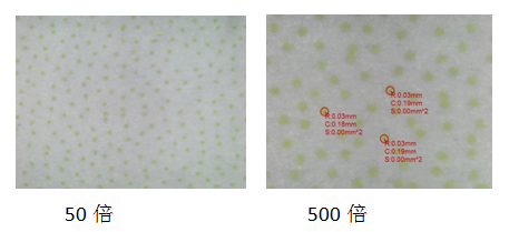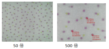 截取CMYK四色塊,放大50及500倍觀察點(diǎn)型點(diǎn)徑,500倍放大后點(diǎn)徑均值為0.03mm左右,墨滴落點(diǎn)間距控制均勻。