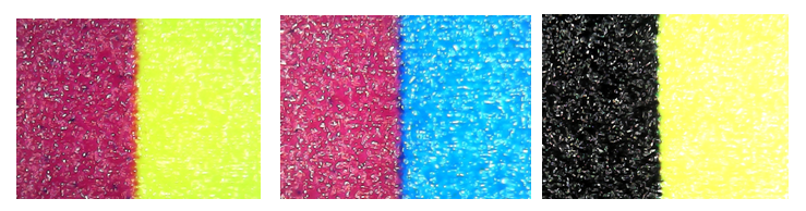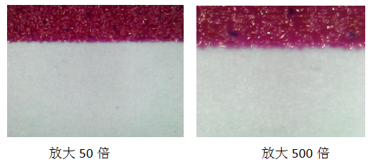 500倍下,色塊對比顯示噴墨均勻,遮蓋率好,連續(xù)打印下的色彩飽和度一致。