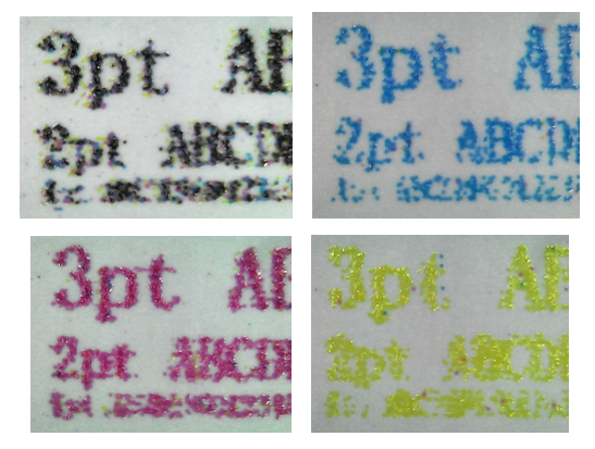 放大50倍顯示效果理想,在放大500倍下顯示,線條可識別,四色疊印還算優(yōu)秀,線條偶有斷續(xù)。